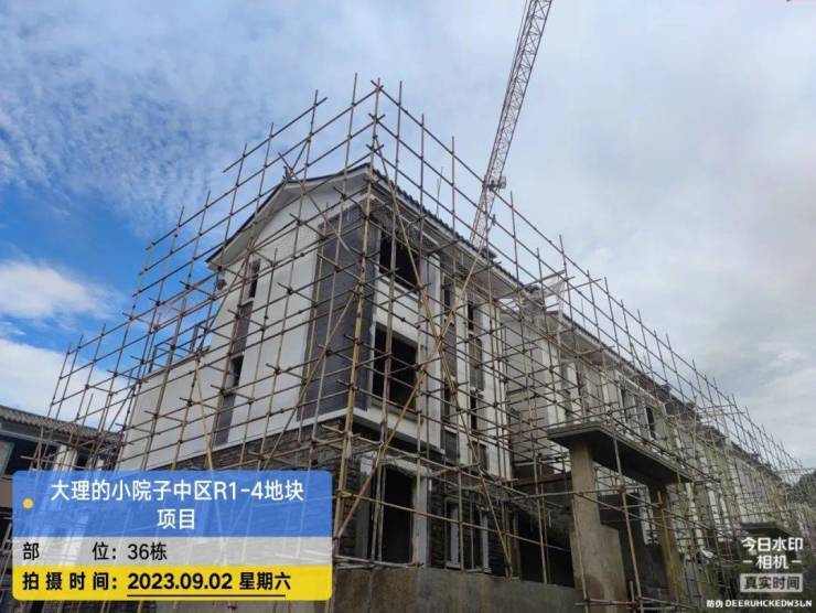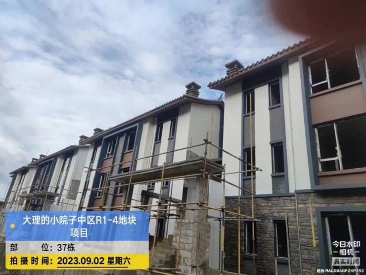 36栋砌体完成,内墙抹灰完成。外墙抹灰完成,屋面防水完成。屋面瓦施工完成100%;保温砂浆完成100%,抗裂砂浆完成100%腻子完成100%,文化石完成85%,小青砖完成85%。庭院给排水管未安装,室内给排水、二配安装完成50%。