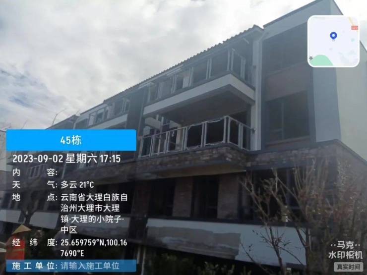 45栋砌体完成100%、内墙抹灰完成100%,外墙抹灰完成100%,屋面防水完成100%;外架拆除完成100%;窗安装完成100%;外墙保温砂浆完成100%、抗裂砂浆完成100%,腻子粉完成100%,涂料完成98%;文化石完成85%,小青砖完成85%,屋面瓦施工完成;前庭院给排水管未安装,室内给排水、二配安装完成。