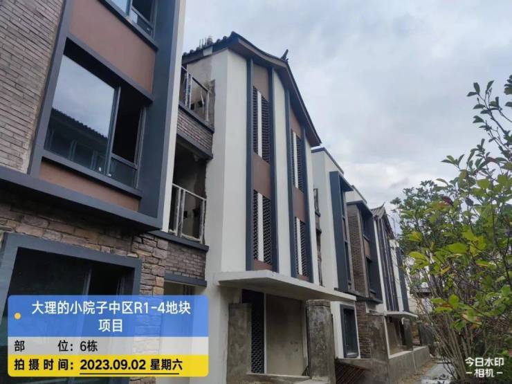 6栋砌体完成,内墙抹灰完成,外墙抹灰完成,外架拆除完成,屋面防水完成,庭院防水完成,露台防水完成,门窗收口完成,厨卫防水完成70%。门窗安装完成70%;二层、三层栏杆安装完成100%;外墙保温砂浆完成100%、抗裂砂浆完成100%;腻子粉完成100%,涂料完成100%;屋面瓦施工完成100%;文化石完成100%,小青砖完成100%,EPS线条完成100%;成品滴水线完成100%;镂空瓦完成100%。室外雨污水管网完成100%。室外给水管道完成100%;室内给排水、二配安装完成。