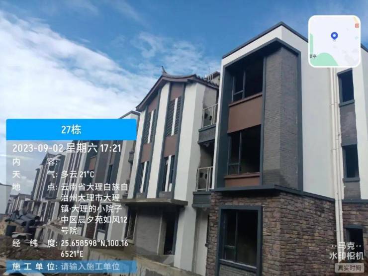 27栋砌体完成100%、内墙抹灰完成100%,外墙抹灰完成100%,屋面防水完成100%;外架拆除完成100%;窗安装完成100%;外墙保温砂浆百分100%、抗裂砂浆完成100%,腻子粉完成100%,涂料完成98%;文化石完成85%,小青砖完成85%,屋面瓦施工完成;庭院给排水管未安装,室内给排水、二配安装完成。