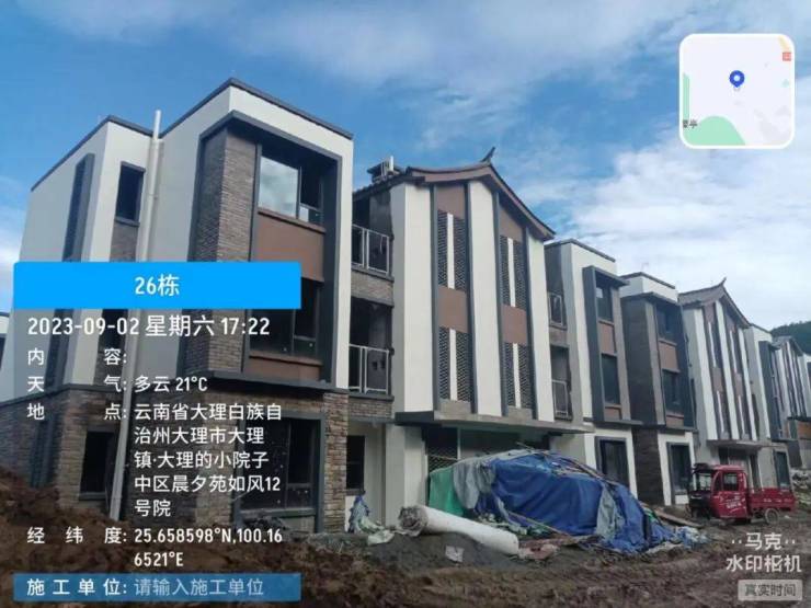 26栋砌体完成100%、内墙抹灰完成100%,外墙抹灰完成100%,屋面防水完成100%;外架拆除完成100%;窗安装完成100%;外墙保温砂浆百分100%、抗裂砂浆完成100%,腻子粉完成100%,涂料完成98%;文化石完成85%,小青砖完成85%,屋面瓦施工完成;庭院给排水管未安装,室内给排水、二配安装完成。