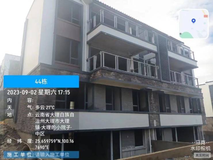 44栋砌体完成100%、内墙抹灰完成100%,外墙抹灰完成100%,屋面防水完成100%;外架拆除完成100%;窗安装完成100%;外墙保温砂浆百分100%、抗裂砂浆完成100%,腻子粉完成100%,涂料完成98%;文化石完成85%,小青砖完成85%,屋面瓦施工完成;庭院给排水管未安装,室内给排水、二配安装完成。