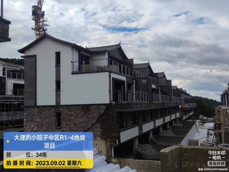 34栋砌体完成,内墙抹灰完成,外墙抹灰完成,外架拆除完成,屋面防水完成,露台防水完成。门窗安装完成70%;二层、三层栏杆安装完成100%;屋面瓦施工完成100%;外墙保温砂浆完成50%,抗裂砂浆完成100%;腻子完成100%,涂料完成100%,文化石完成100%,小青砖完成100%,EPS线条完成100%;庭院给排水管未安装,室内给排水、二配安装完成。