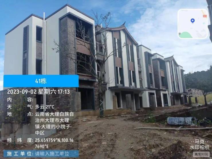 41栋砌体完成100%、内墙抹灰完成100%,外墙抹灰完成100%,屋面防水完成100%;外架拆除完成100%;窗安装完成100%;外墙保温砂浆百分100%、抗裂砂浆完成100%,腻子粉完成100%,涂料完成98%;文化石完成85%,小青砖完成85%,屋面瓦施工完成;庭院给排水管未安装,室内给排水、二配安装完成。
