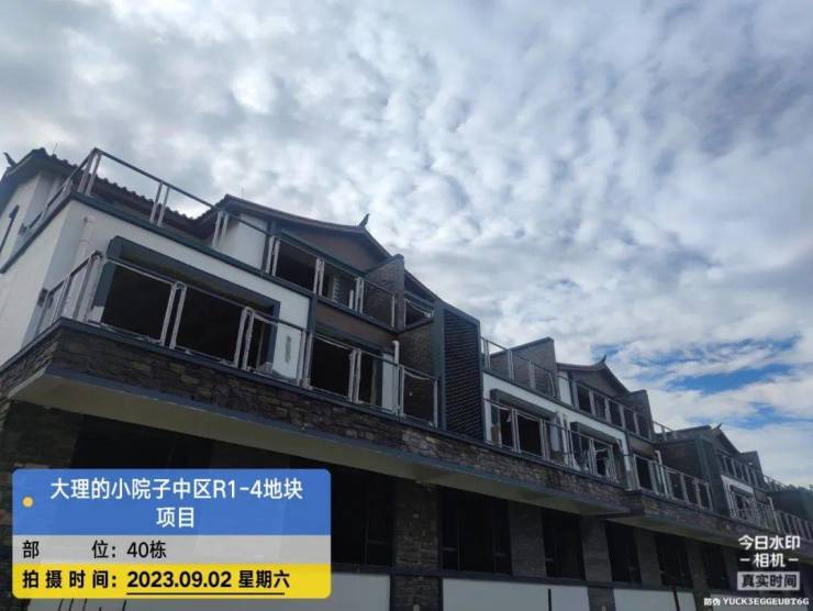 40栋砌体完成,内墙抹灰完成,外墙抹灰完成,外架拆除完成,屋面防水完成,露台防水完成。门窗安装完成70%;二层、三层栏杆安装完成100%;屋面瓦施工完成100%;外墙保温砂浆百分100%、抗裂砂浆完成100%;腻子完成100%,涂料完成100%,;文化石完成100%,小青砖完成100%,EPS线条完成100%。成品滴水线完成100%。镂空瓦完成100%;庭院给排水管未安装,室内给排水、二配安装完成。