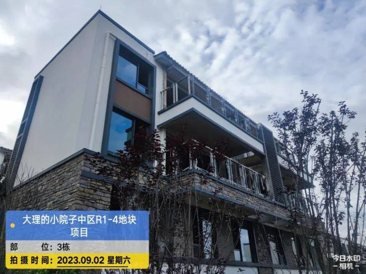 3栋砌体完成,内墙抹灰完成,外墙抹灰完成,外架拆除完成,屋面防水完成,庭院防水完成,露台防水完成,厨卫防水完成70%。门窗安装完成70%;二层、三层栏杆安装完成100%;外墙保温砂浆、完成100%,抗裂砂浆完成100%;涂料完成100%;屋面瓦施工完成;文化石完成100%,小青砖完成100%,EPS线条完成100%。成品滴水线完成100%;镂空瓦完成100%。室外雨污水管网完成100%。室外给水管道完成100%;室内给排水、二配安装完成。