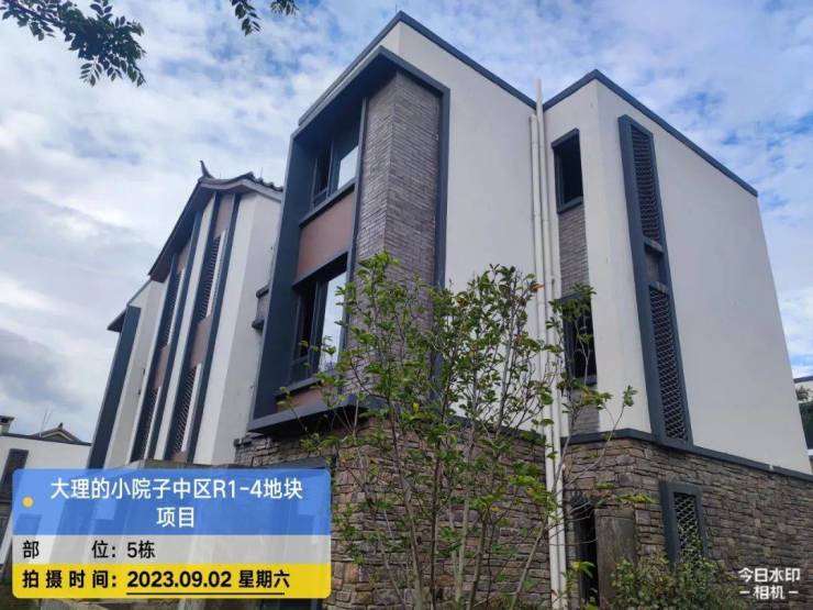 5栋砌体完成,内墙抹灰完成,外墙抹灰完成,外架拆除完成,屋面防水完成,庭院防水完成,露台防水完成,厨卫防水完成60%。门窗安装完成70%;二层、三层栏杆安装完成100%;外墙保温砂浆完成100%、抗裂砂浆完成100%;腻子粉完成100%,涂料完成100%;屋面瓦施工完成100%;文化石完成100%,小青砖完成100%,EPS线条完成100%。成品滴水线完成100%;镂空瓦完成100%。室外雨污水管网完成100%。室外给水管道完成100%;室内给排水、二配安装完成。