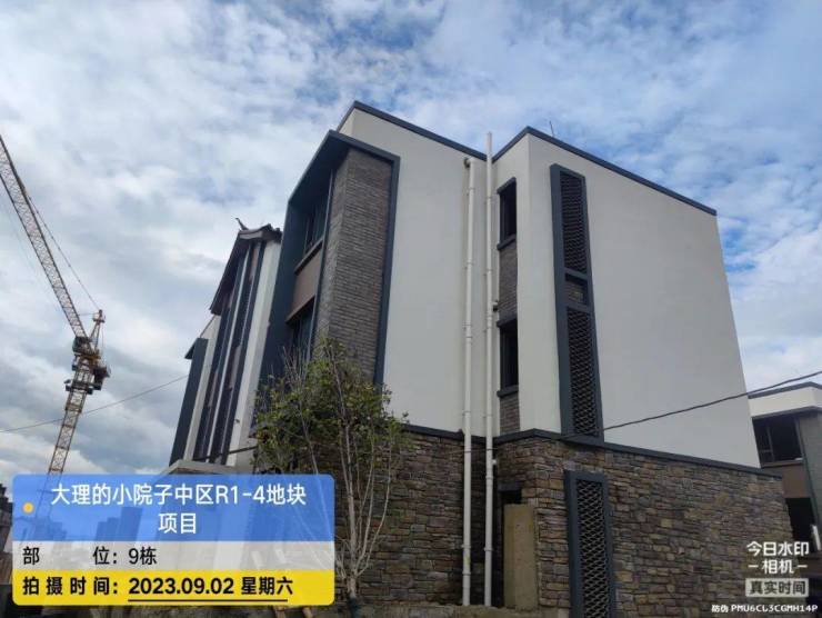9栋砌体完成,内墙抹灰完成,外墙抹灰完成,外架拆除完成,屋面防水完成,庭院防水完成,露台防水完成,门窗收口完成20%。外墙保温砂浆百分100%、抗裂砂浆完成100%;腻子粉完成100%,涂料完成100%;屋面瓦施工完成;文化石完成100%,小青砖完成100%,EPS线条完成100%。成品滴水线完成100%;镂空瓦完成100%。室外雨污水管网完成100%。室外给水管道完成100%;室内给排水、二配安装完成。