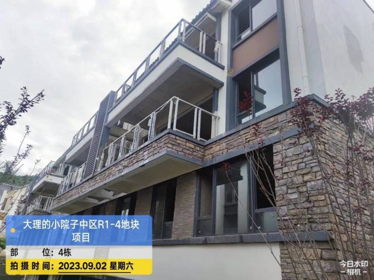 4栋砌体完成,内墙抹灰完成,外墙抹灰完成,外架拆除完成,屋面防水完成,庭院防水完成,露台防水完成,门窗收口完成,厨卫防水完成60%。门窗安装完成70%;二层、三层栏杆安装完成100%;外墙保温砂浆百分之100%、抗裂砂浆完成100%;腻子粉完成100%,涂料完成100%;小青砖完成100%,文化石完成100%,EPS线条完成100%,成品滴水线完成100%;屋面瓦施工完成100%;镂空瓦完成100%。室外雨污水管网完成100%。室外给水管道完成100%;室内给排水、二配安装完成。