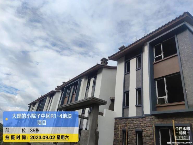 35栋砌体完成,内墙抹灰完成100%,外墙抹灰完成,外架拆除完成,屋面防水完成,露台防水完成。门窗安装完成70%;屋面瓦施工完成100%;二层、三层栏杆安装完成100%;外墙保温砂浆完成100%,抗裂砂浆完成100%;文化石完成100%,小青砖完成100%,EPS线条完成100%。腻子完成100%,涂料完成100%;庭院给排水管未安装,室内给排水、二配安装完成。