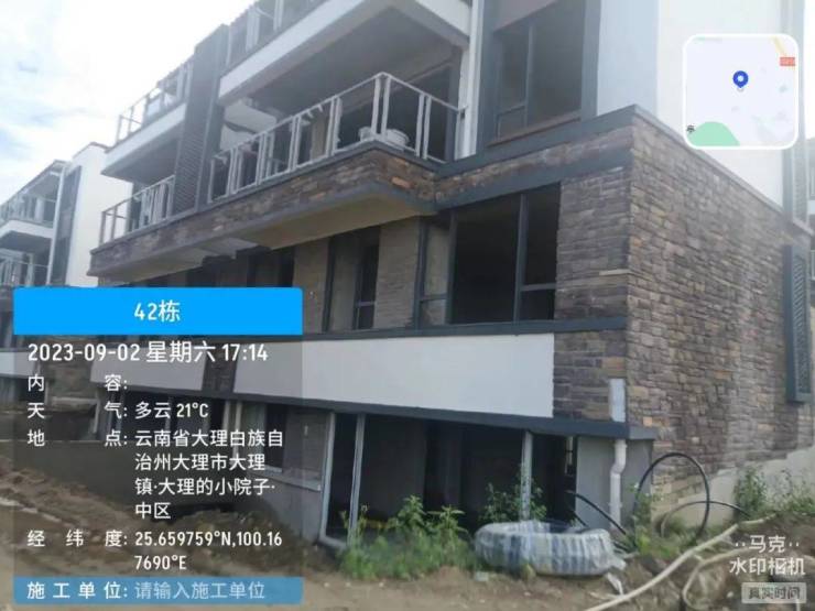 42栋砌体完成100%、内墙抹灰完成100%,外墙抹灰完成100%,屋面防水完成100%;外架拆除完成100%;窗安装完成100%;外墙保温砂浆百分100%、抗裂砂浆完成100%,腻子粉完成100%,涂料完成98%;文化石完成85%,小青砖完成85%,屋面瓦施工完成;庭院给排水管未安装,室内给排水、二配安装完成。