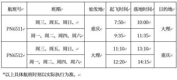 据介绍,此次开通的重庆=大理航线由空客A320机型执行,航班号为PN6511/PN651112,每日执行一班。其中周三、五、日7点50分从重庆起飞,10点抵达大理,11点10分从大理起飞,13点10分抵达重庆;每周一、二、四、六9点35分从重庆起飞,11:35分抵达大理,12点20分从大理起飞,14点15抵达重庆。