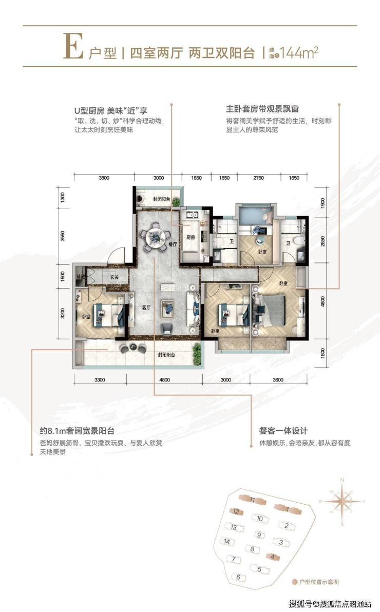 140户型 4.8 米客厅开间,8.1 米阳台,南北通透,四开间朝南,电梯相对独立入户,可扩展面积高;