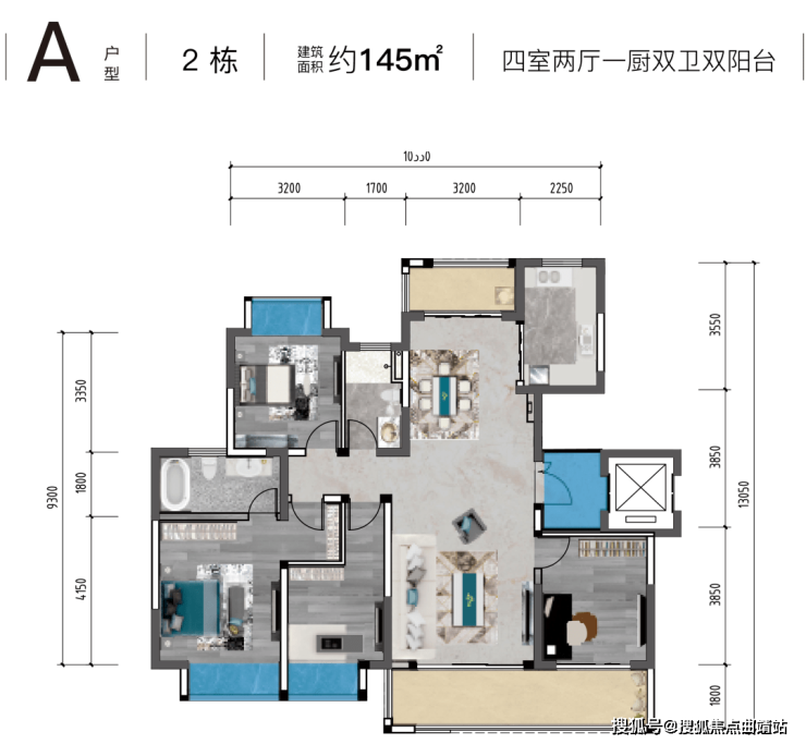 A户型建面约145㎡四室两厅一厨两卫双阳台