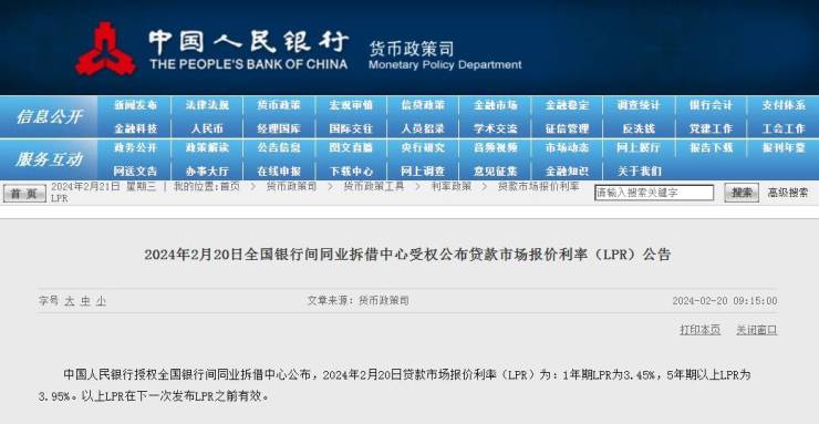 中国人民银行授权全国银行间同业拆借中心公布,2024年2月20日贷款市场报价利率(LPR)为:1年期LPR为3.45%,5年期以上LPR为3.95%。以上LPR在下一次发布LPR之前有效。