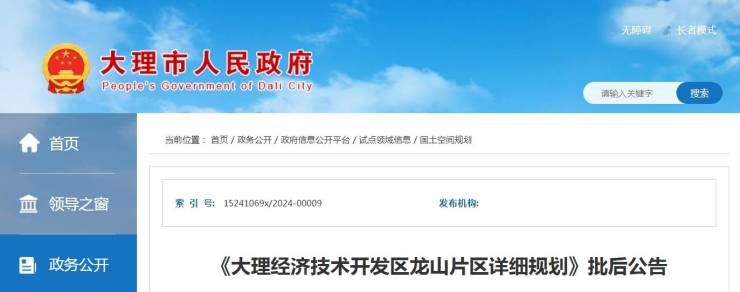 2023年10月20日,《大理经济技术开发区龙山片区详细规划》通过大理经济技术开发区城乡规划委员会2023年第6次项目审查会审查,2023年10月30日通过大理市国土空间规划委员会2023年第6次项目审查会审查,2023年11月15日通过大理州国土空间规划委员会2023年第2次专题会议审查,2024年5月6日,经大理市人民政府批准实施(大市政复[2024]36号)。