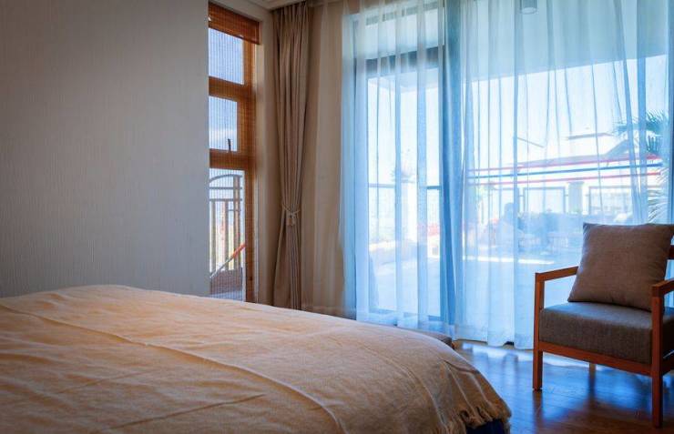 大面积落地玻璃门窗彻底打开了房子的视野,床对面便是美景,视线直抵远方,无限延续了人的内心世界;