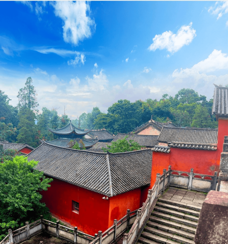 行至崇圣寺,缓而行于级级石阶上,身后是已亮起烛灯的三塔,安静又庄严地矗立于青松之间。身前是一方佛堂,标准的中式建筑里亦添了一分南国特色。