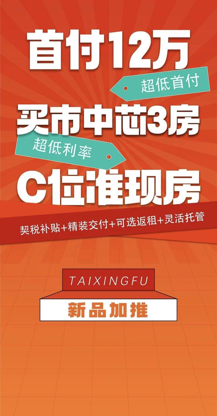 天城·泰兴府,市中芯3房新品加推,首付约12万起!关注天城·泰兴府的朋友可前往售楼处现场看房,咨询房源信息请拨打电话400-156-0036 转 429733!
