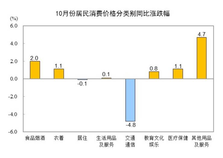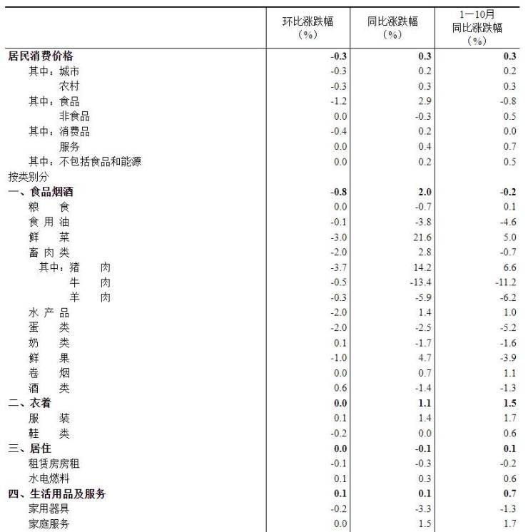 10月份,全国居民消费价格环比下降0.3%。其中,城市下降0.3%,农村下降0.3%;食品价格下降1.2%,非食品价格持平;消费品价格下降0.4%,服务价格持平。