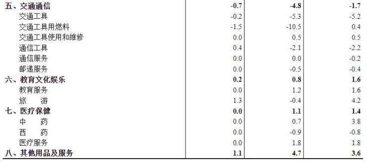 其他七大类价格同比五涨两降。其中,其他用品及服务、衣着、医疗保健价格分别上涨4.7%、1.1%和1.1%,教育文化娱乐、生活用品及服务价格分别上涨0.8%和0.1%;交通通信、居住价格分别下降4.8%和0.1%。