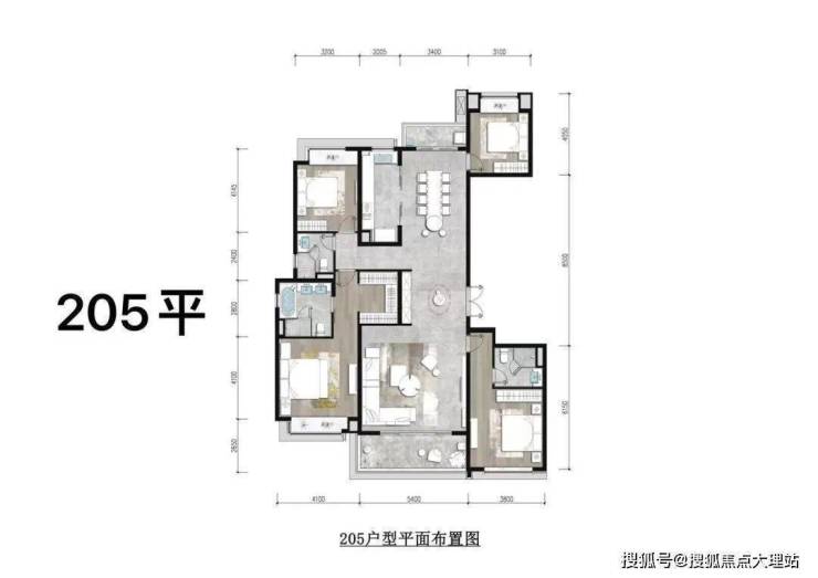 ▲锦粼天序205㎡户型图,205㎡户型,4房2厅3卫设计,多开间朝南;