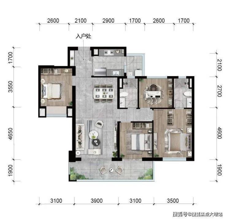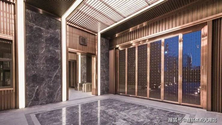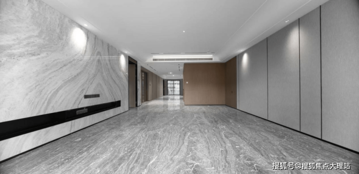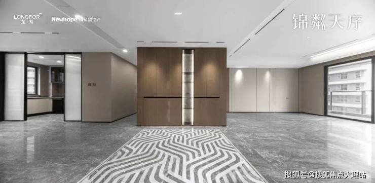昆明龙湖新希望锦粼天序总205㎡大平层餐客厅地面均采用深色系进口石材,中间玄关则是工艺要求和成本更高的水刀拼花。