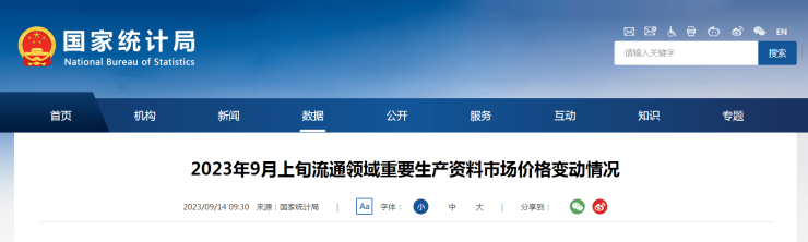 据对全国流通领域9大类50种重要生产资料市场价格的监测显示,2023年9月上旬与8月下旬相比,43种产品价格上涨,7种下降。
