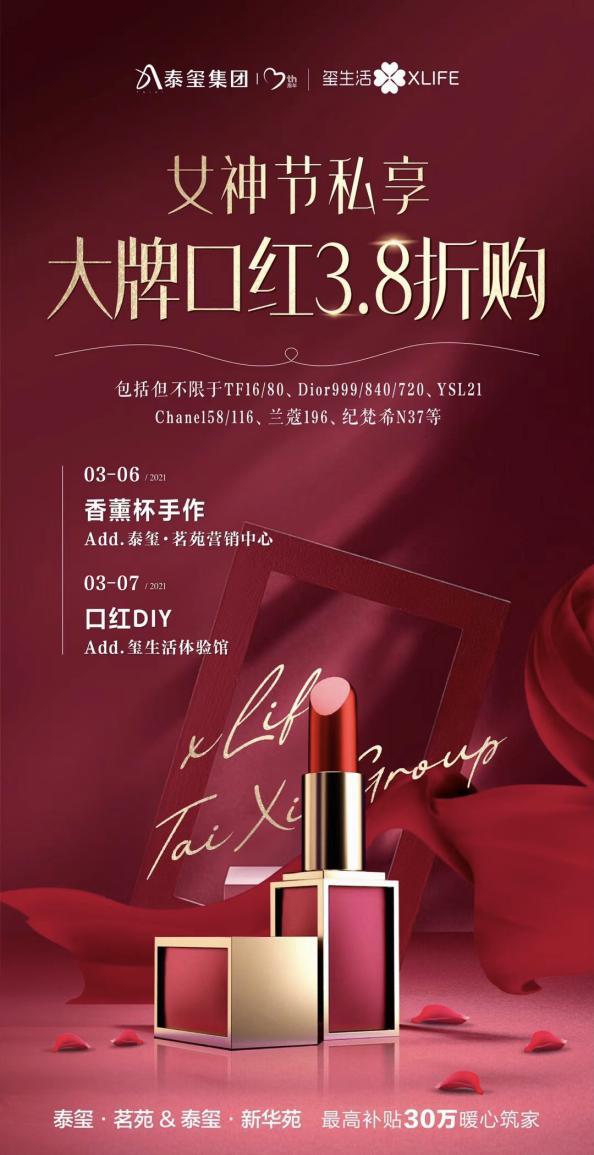 据搜狐焦点大理站获悉,大理泰玺集团“玺生活”女神节大牌口红3.8折购!3月6日香薰手作,地址大理泰玺·茗苑营销中心;3月7日口红DIY,地址玺生活体验馆!