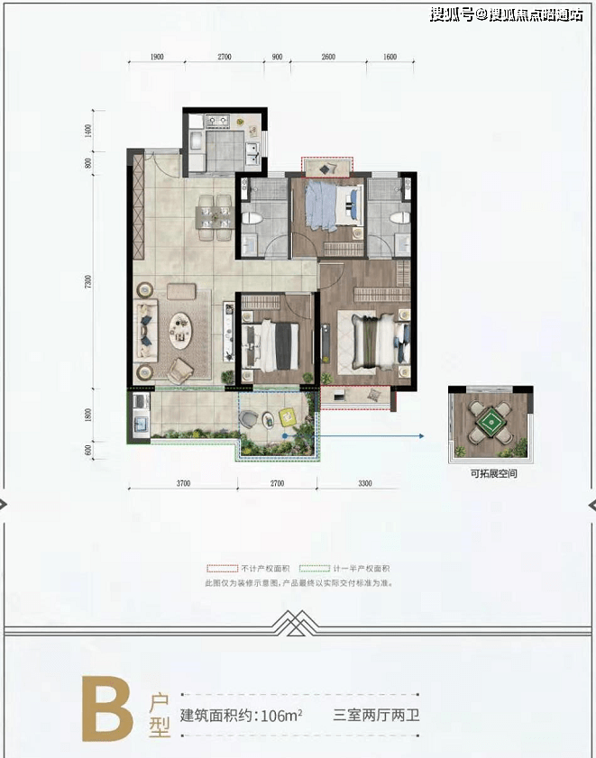 住宅产品面积为79-143㎡,两室至五室的户型设计,总户数约为3200户,车位比例为1:1.15。社区有四个出入口,三个为车行出入口。在东侧、南侧和北侧,地下车库入口布置于外围道路,小区入口即车库入口,有效实现人车分流。