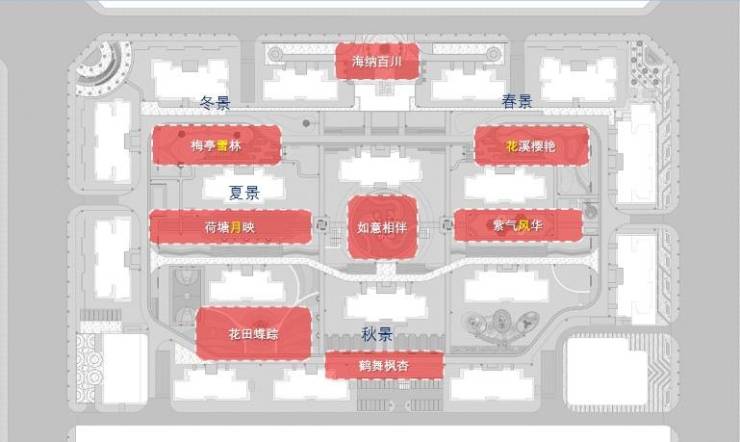 八大景观:海纳百川、梅亭雪林、荷塘月映、如意相伴、花田蝶踪、鹤舞枫杏、花溪樱艳、紫气风华