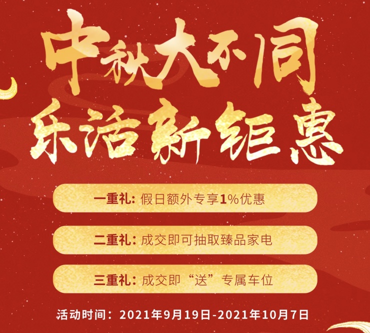 据搜狐焦点大理站获悉,大理雅美湾,中秋大不同,乐活新钜惠,一重礼假日额外专享1%优惠;二重礼成交即可抽取精品家电;三重礼成交即“送”专属车位,活动时间9月19日-10月7日!