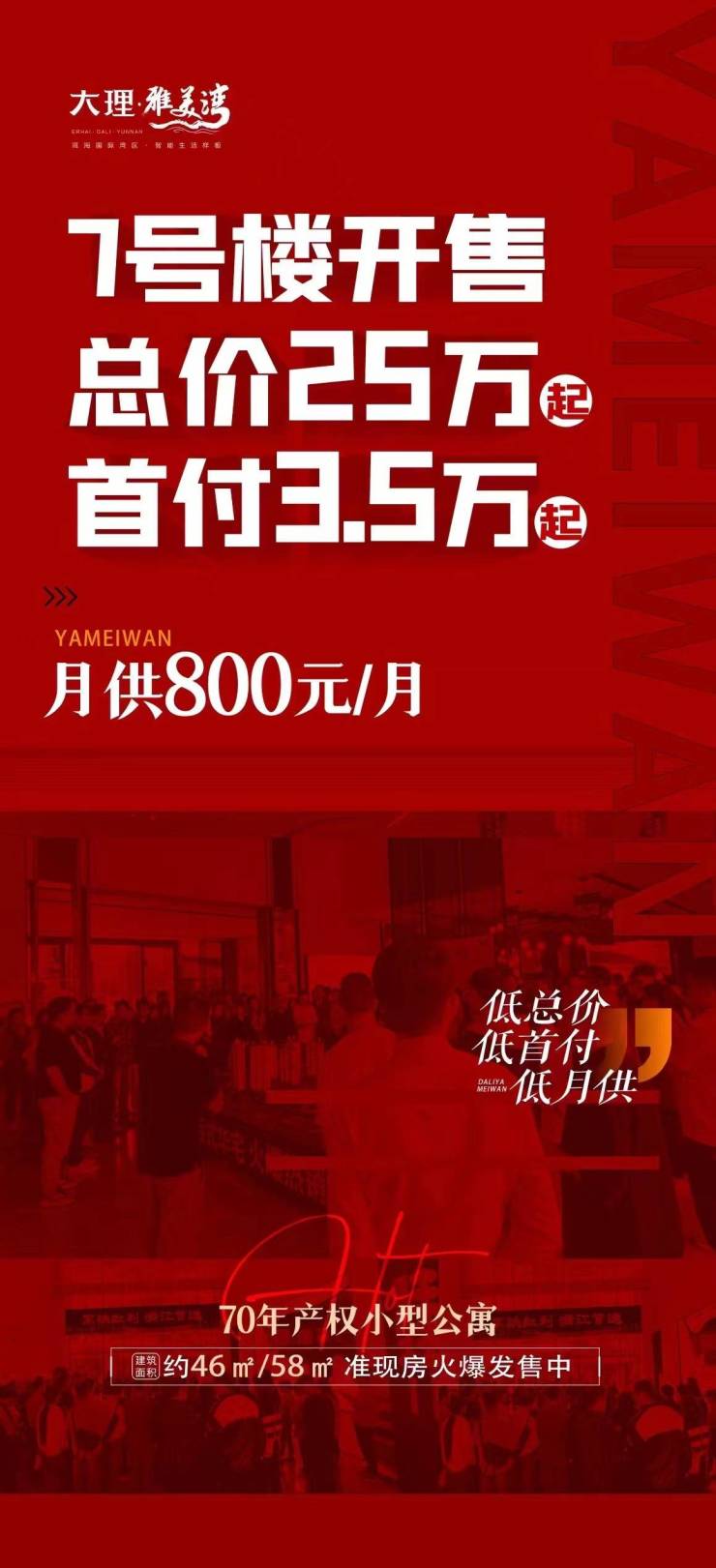 大理雅美湾,建面约46㎡/58㎡70年产权小型公寓,准现房火爆发售中!总价约25万起,首付约3.5万起,月供约800元/月!关注大理雅美湾的朋友可抓紧时间前往售楼处现场看房咨询,联系电话400-156-0036转385895。