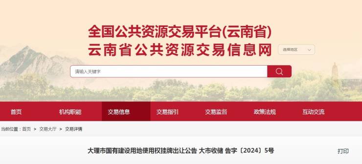 四、本次挂牌出让的详细资料和具体要求,见挂牌出让文件。申请人可于2024年8月6日至2024年8月25日,访问云南省公共资源交易信息网(大理州)http://ggzy.yn.gov.cn/#/homepage,获取挂牌出让文件,并需要在平台注册及办理数字CA证书方可申请竞买。