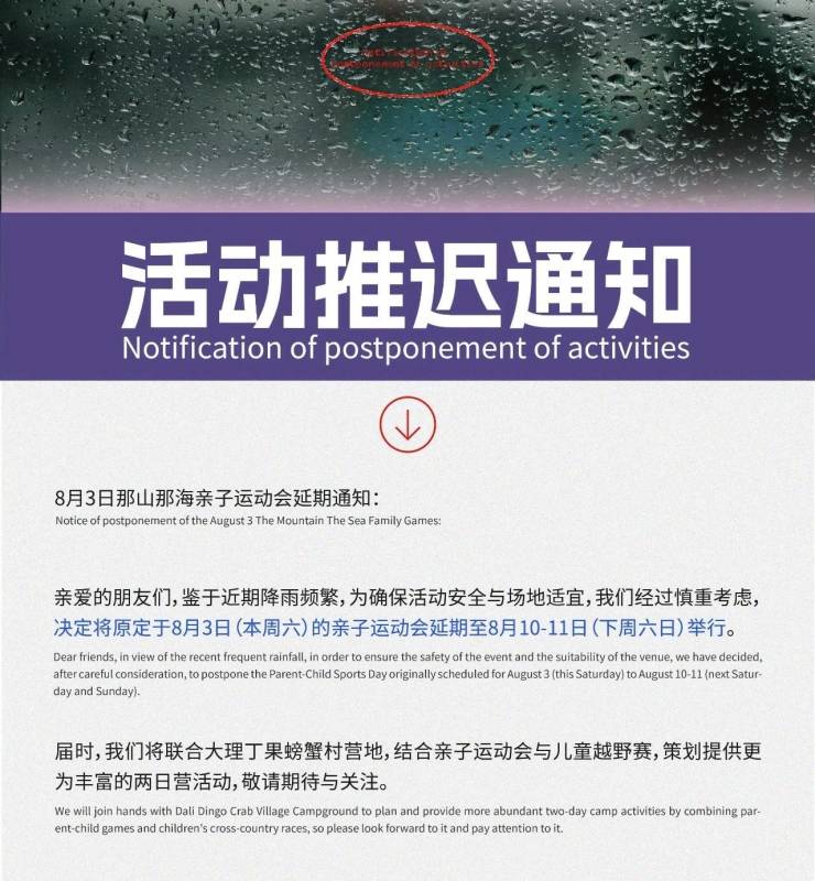 亲爱的朋友们,鉴于近期降雨频繁,为确保活动安全与场地适宜,我们经过慎重考虑,决定将原定于8月3日(本周六)的亲子运动会延期至8月10-11日(下周六日)举行。