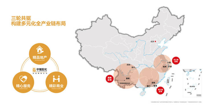 华夏阳光以深耕城市的企业战略,稳健拓步全国,现已布局西南、珠三角、长三角等核心经济圈。同时以“精品地产+精彩商业+精心服务”三轮驱动为产业支柱,围绕客户全生命周期构建全产业链布局,集地产开发、商业运营、物业服务、酒店管理、餐饮品牌管理等业务于一体,多元化产业链并行的特色发展模式,带来全维度的精致生活体验。