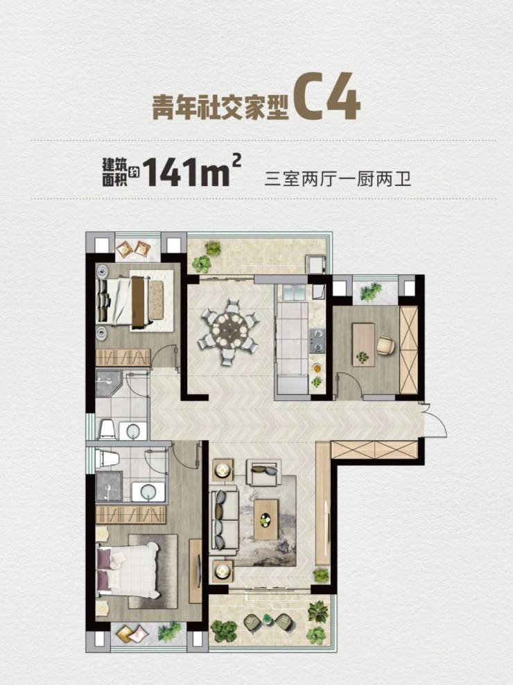 C4户型-隐逸之云,窗外是开阔的城市天际线,可远眺山野湖景,居其间,动静皆宜,云卷云舒。窗内是精神富足的静谧场域,在通透、灵动的空间自在游走,呈现出一种既温润又独特的空间个性。