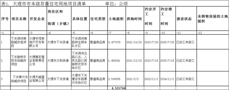 近日,大理市自然资源局发布《大理市市本级2024年度二季度存量住宅用地信息表》。2024年度二季度,大理市本级存量住宅用地规模约4.53公顷,涉及三个城改项目。