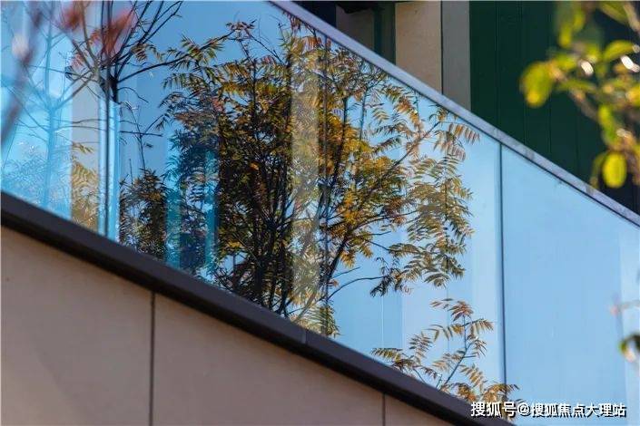 晶莹剔透的玻璃砖景墙在穿过树叶洒下来的日光照射下光影变幻、岁月鎏金。