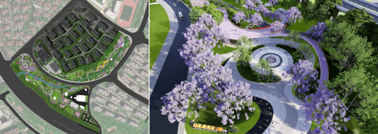 • 运动体系:600米健康跑道+健身器械区+社区体育场地,地面采用悦动铺装,周边种植大腹木棉、现代月季,运动同时享受花香与绿意。