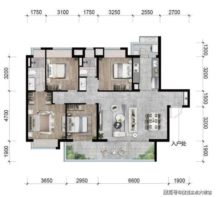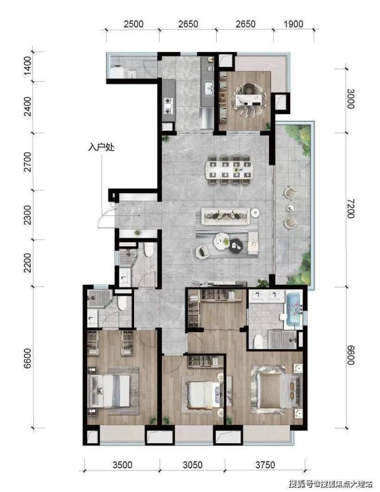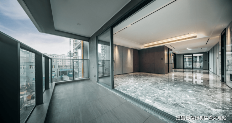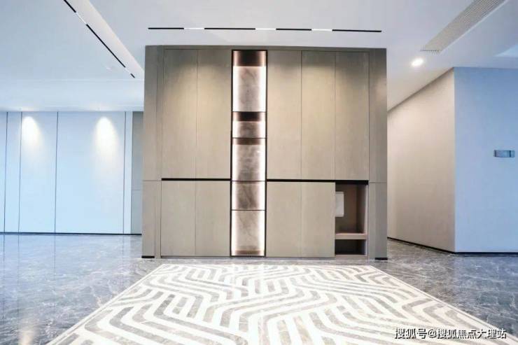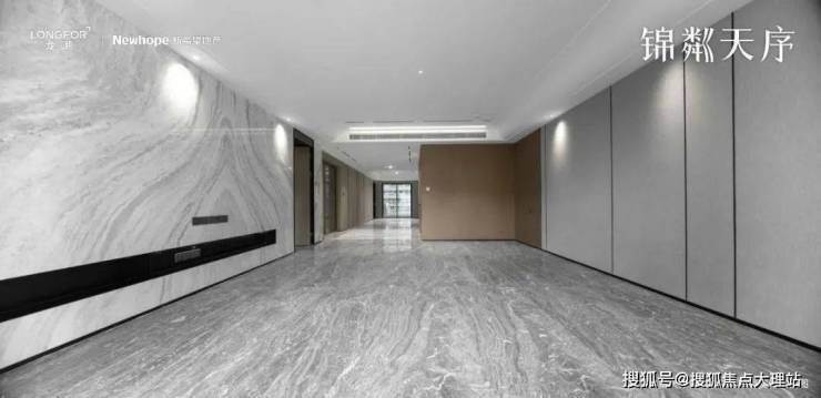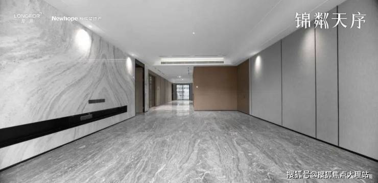 昆明龙湖新希望锦粼天序总205㎡大平层餐客厅地面均采用深色系进口石材,中间玄关则是工艺要求和成本更高的水刀拼花。