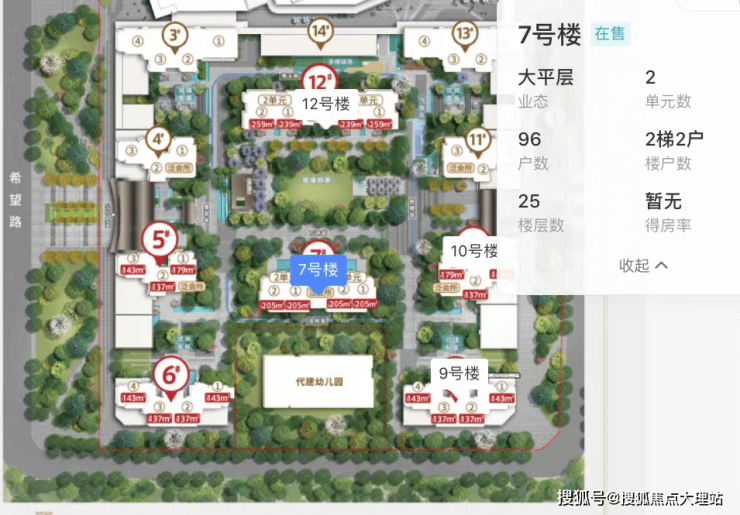 7和12栋为板式楼,其中7栋总高25层,正南北朝向,梯户比为2梯2户,户型分布205㎡户型,12栋户型面积为240和260的大平层。