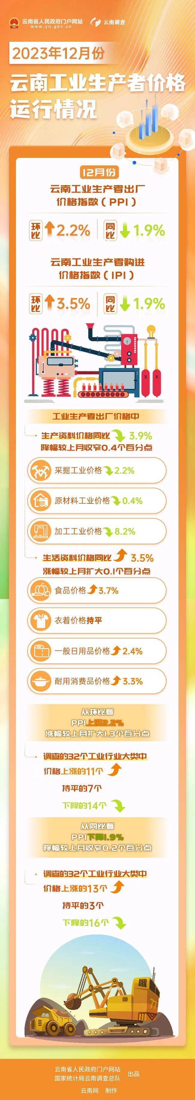国家统计局云南调查总队根据国家现行统计调查制度开展的工业生产者价格调查结果显示:2023年12月份,云南工业生产者出厂价格指数(PPI)环比上涨2.2%,同比下降1.9%,降幅较上月收窄0.2个百分点。工业生产者购进价格指数(IPI)环比上涨3.5%,同比下降1.9%,降幅较上月收窄0.9个百分点。2023年全年云南工业生产者出厂价格下降3.3%,工业生产者购进价格下降3.2%。