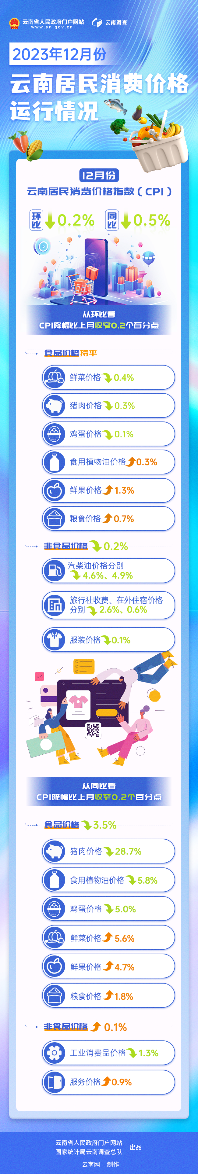 国家统计局云南调查总队根据国家现行统计调查制度开展的居民消费价格调查结果显示:2023年12月份,受国际油价下行和出行等服务消费季节性回落影响,云南居民消费价格指数(CPI)环比下降0.2%,同比下降0.5%。2023年全年云南居民消费价格上涨0.3%。