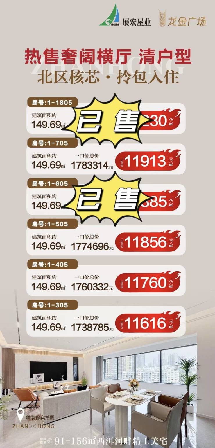 展宏·龙金广场,建面约91-156㎡西洱河畔精工美宅,热售奢阔横厅清户型,北区核芯拎包入住!关注展宏·龙金广场的朋友可前往售楼处现场看房,咨询房源信息请拨打电话4001560036