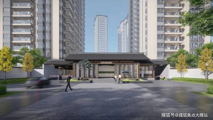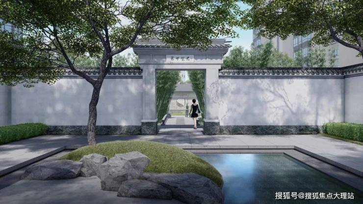 “一进”【呈镜坊】,大门采用中国传统建筑坡屋顶,以青瓦白墙挑檐设计,运用廊柱形成的开阔门廊立面,展现中式宅院的入口礼序;门前种植的造型松高矮搭配、动静有致,体现中式山水意境感。