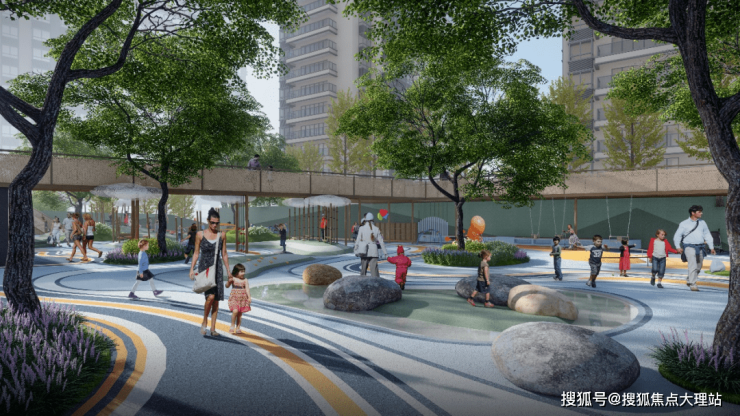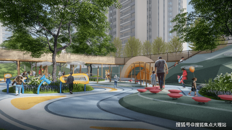 经观澜亭至观山栈道抵达儿童活动区。根据儿童年龄层次与身心发展特点,以“峡谷探险”为主题,打造一个内凹式的多元复合的全龄儿童活动场地。设置认知墙、滑梯等,帮助提高小孩子认知能力;在这里让每个有着冒险天性和好奇心的孩子,随时都能体验到风的触感、阳光的温度、花草四季的变化,360°呵护孩子成长。