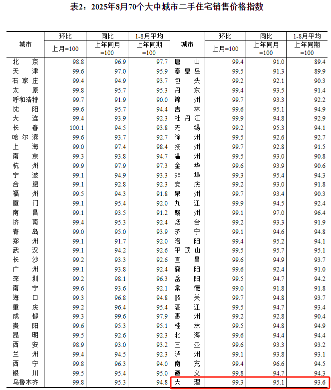根据发布的数据来看,2025年8月份大理市新建商品住宅销售价格环比下跌0.6%,同比下跌4.2%;2025年8月份大理市二手住宅销售价格环比下跌0.7%,同比下跌4.9%。