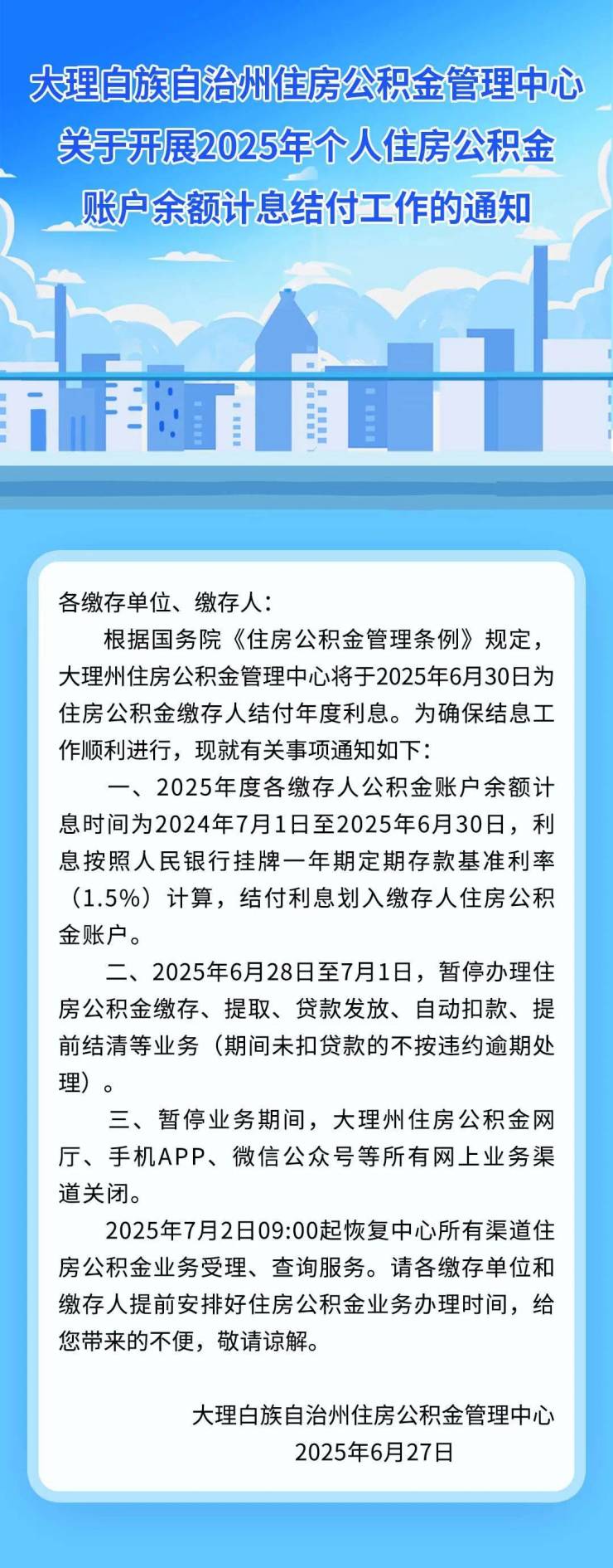 各缴存单位、缴存人:根据国务院《住房公积金管理条例》规定,大理州住房公积金管理中心将于2025年6月30日为住房公积金缴存人结付年度利息。