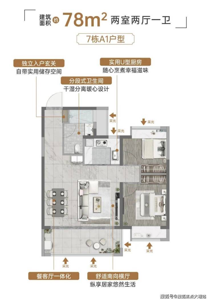 能建·未来城建面约78㎡户型,2室2厅1卫设计,动静分区,带独立入户玄关,U型厨房,餐客厅一体做出横厅效果,再连通阳台,采光和视野优渥;两个卧室均带飘窗,卫生间干湿分离,明厨明卫。功能性与舒适度巧妙结合,满足单身菁英、新婚夫妇等家庭对生活的美好畅想。